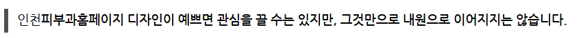 즉, 인천피부과홈페이지는 단순한 소개 페이지가 아니라 마케팅 전략을 반영하고, 지속적으로 업데이트할 수 있는 실전형 플랫폼이