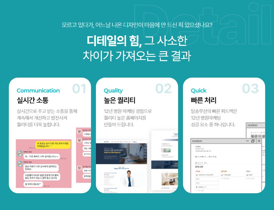 탐솔루션은 홈페이지를 기획할 때부터 마케팅을 고려합니다. 방문자의 시선을 어디에 둘지, 클릭 유도는 어떻게 할지, 환자가