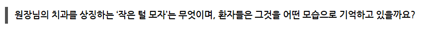 환자들이 병원 이름만 들어도 떠올릴 수 있는 우리만의 ‘작은 털 모자’, 즉 고유한 상징이 필요합니다. 이것이 바로 브랜딩이며,