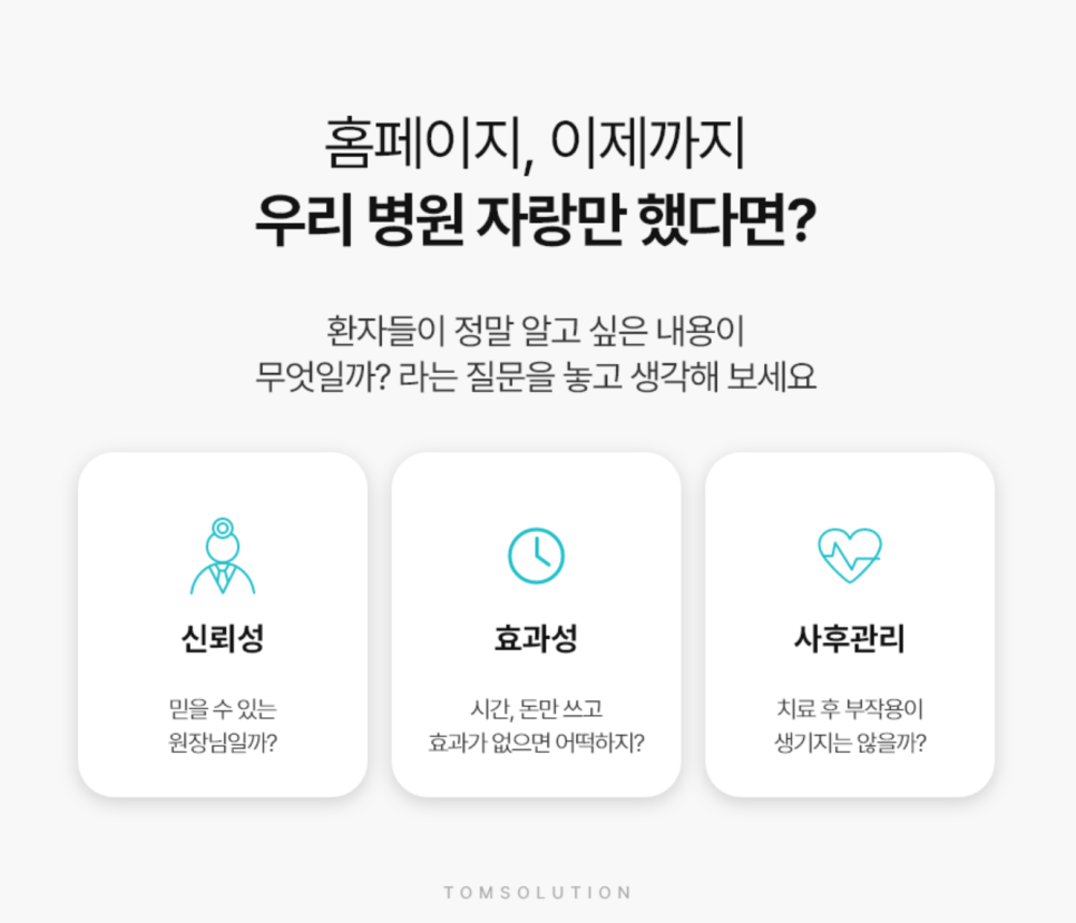 홈페이지는 병원의 얼굴과도 같습니다. 환자 입장에서는 병원을 직접 오기 전에 가장 먼저 접하는 정보가 홈페이지거든요. 그런데