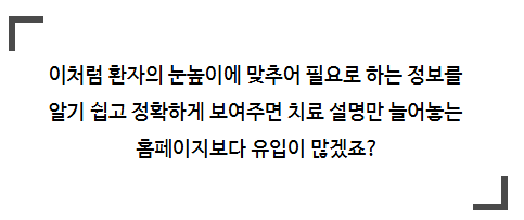 치료는 결국 사람을 향합니다. 그런데 병원의 전문성을 강조한다고 내용을 논문처럼 딱딱하세 쓴다면 홈페이지를 보고