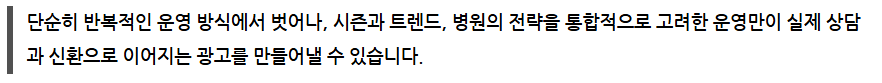 또한, 단순히 시즌에 맞춘 키워드뿐 아니라, 우리 병원이 중점적으로 밀고 있는 시술 전략과도 통합적으로 검토해야 합니다.
